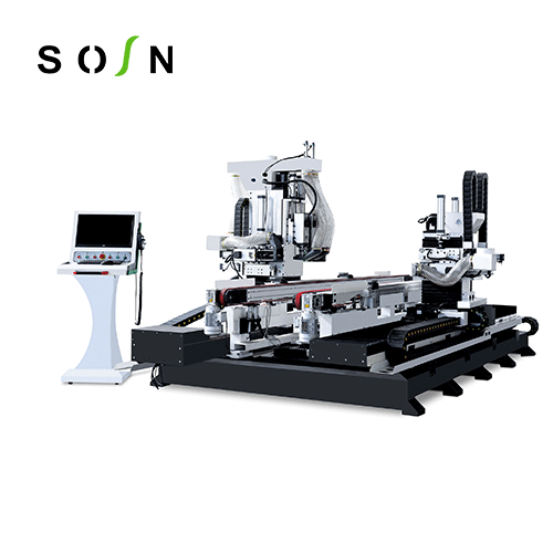 功能:門扇鎖、合頁(yè)等五金件安裝孔、槽的加工。特點(diǎn):自動(dòng)對(duì)刀功能,保證換刀,斷刀更換時(shí)的加工精度。 主軸正反旋設(shè)計(jì)銑削,確保加工不崩邊,崩角,提高加工質(zhì)量。 門扇鎖孔,合頁(yè)兩側(cè)同時(shí)加工,提高生產(chǎn)加工的效率。 真空吸附平臺(tái),自動(dòng)測(cè)寬,測(cè)厚功能,滿足不同寬度,厚度門扇的精確