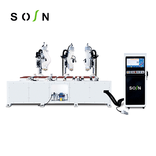 功能: 門套鎖舌,合頁安裝孔、槽的加工。特點(diǎn):自動(dòng)對刀功能,保證換刀,斷刀更換時(shí)的加工精度。 主軸正反旋設(shè)計(jì)銑削,確保加工不崩邊,崩角,提高加工質(zhì)量。 門套鎖舌,合頁功能,門套寬度方向夾緊靠料功能,確保門套長度方向上的彎曲。 氣動(dòng)夾具夾緊,可根據(jù)加工長度靈活調(diào)整,滿足不同長度門套